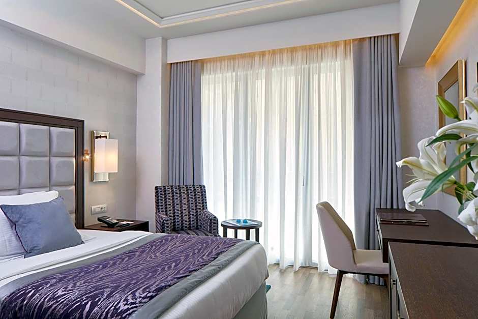 Deluxe Room with balcony & Acropolis view is 312 square feet and includes either a queen-size bed 150-154 width or 2 single beds 80-130 width plus desk, satellite tv , hairdryer, tea and coffee making facilities , ironing set, safe, bathrobes, and slippers.