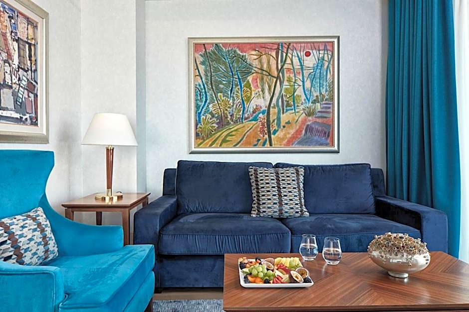 Acropolis Suite is 517 square feet and includes a queen-size bed 150-154 width plus living room, desk, satellite tv , hairdryer, tea and coffee making facilities , ironing set, safe, and slippers.
